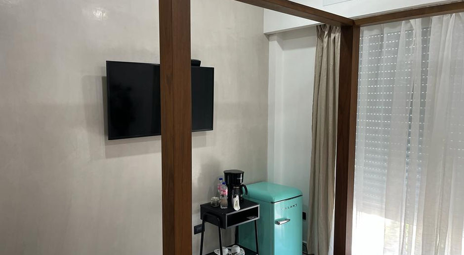 Adjacent to the penthouse is a charming beach-view apartment, exuding cozy charm with its one-bedroom layout. Further below, three additional rooms are adorned with vintage mini refrigerators, adding a touch of retro elegance. These rooms cater to individual travelers or can be combined to accommodate groups, offering flexible options for every guest.